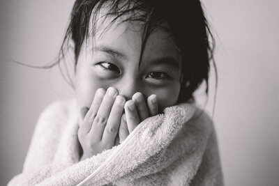 私は、子どもたちがお風呂から上がってくると、頭から子供の顔を隠すようにバスタオルをばさっとかけます。そうすると、タオルから顔が出てくる時の子どもたちはいつも変顔!子どもたちも、「ママが好きな顔〜」と、私が楽しみにしているのを知っていてやってくれるのです。